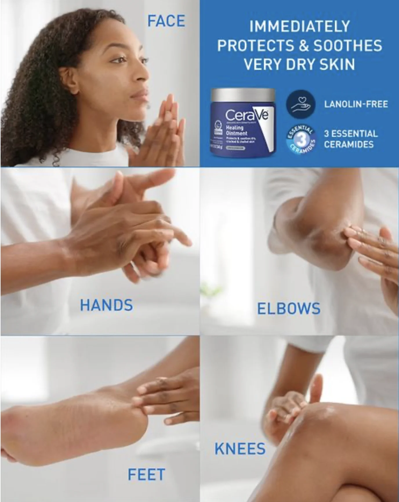 El CeraVe Healing Ointment está diseñado para hidratar intensamente, proteger y ayudar a reparar la piel muy seca, agrietada o irritada.