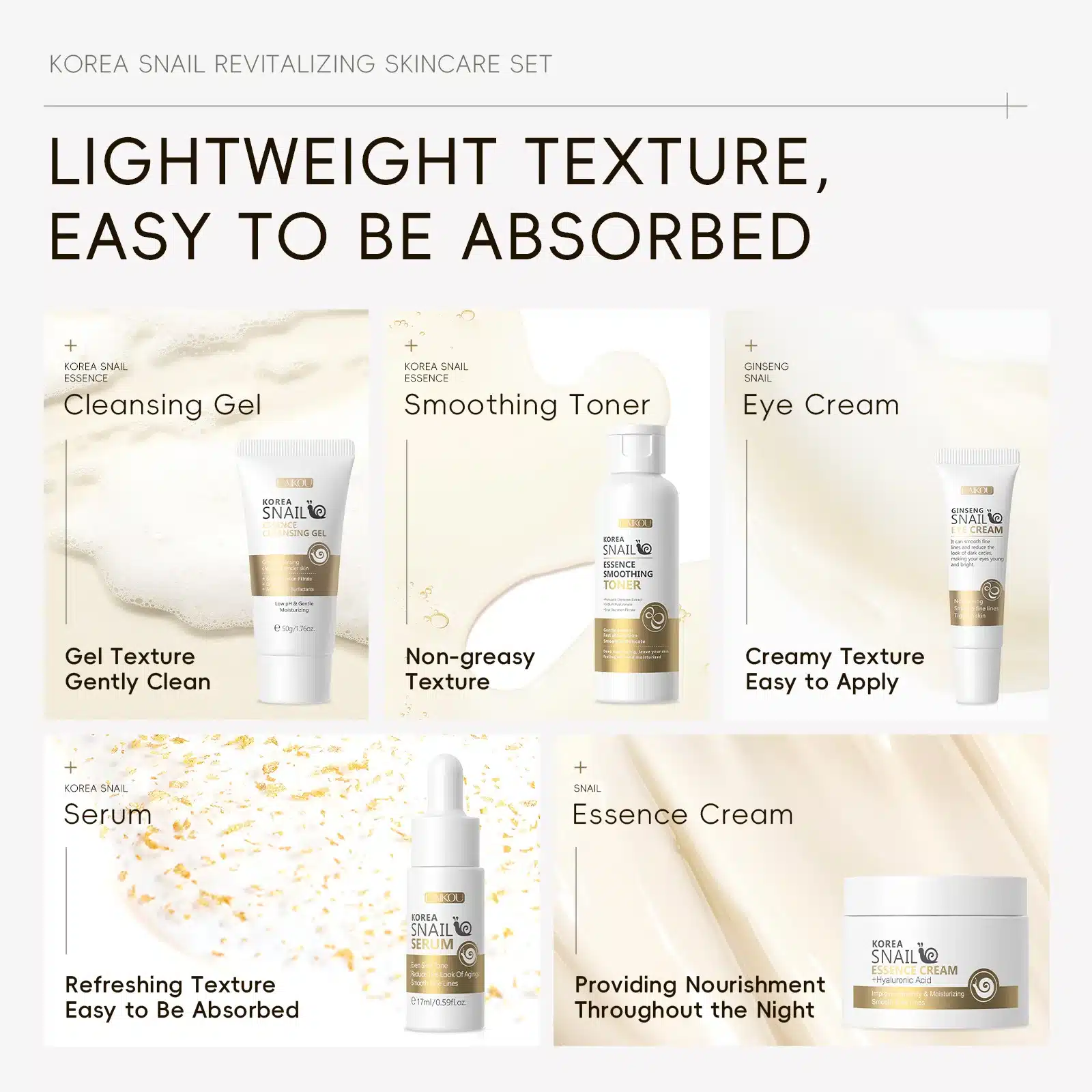 El LAIKOU Snail Skin Care Set 5 en 1 es una rutina facial coreana diseñada para reparar, hidratar y regenerar la piel en profundidad. Formulado con extracto de baba de caracol, ayuda a mejorar la textura cutánea, reducir imperfecciones y aportar un aspecto más suave, luminoso y uniforme.