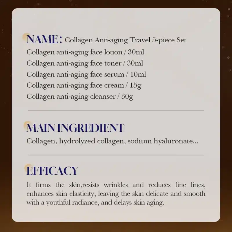 Este set incluye limpiador, sérum, esencia, contorno de ojos y crema facial, ofreciendo un cuidado integral que actúa desde la limpieza hasta la hidratación final. Su textura ligera facilita la absorción sin dejar sensación pesada, siendo adecuado para el uso diario.