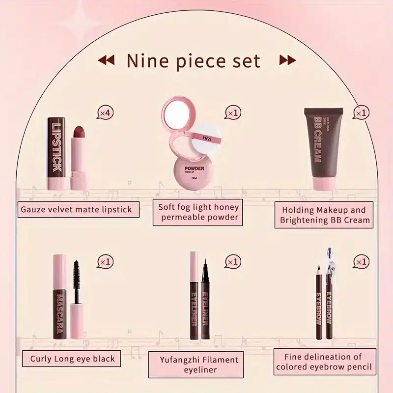 El set de maquillaje VERONNI 9 piezas es la solución perfecta para quienes buscan un kit completo, funcional y listo para usar en cualquier ocasión. Diseñado especialmente como opción de regalo, este estuche incluye todo lo necesario para crear un maquillaje completo: desde base ligera hasta definición de ojos y labios.