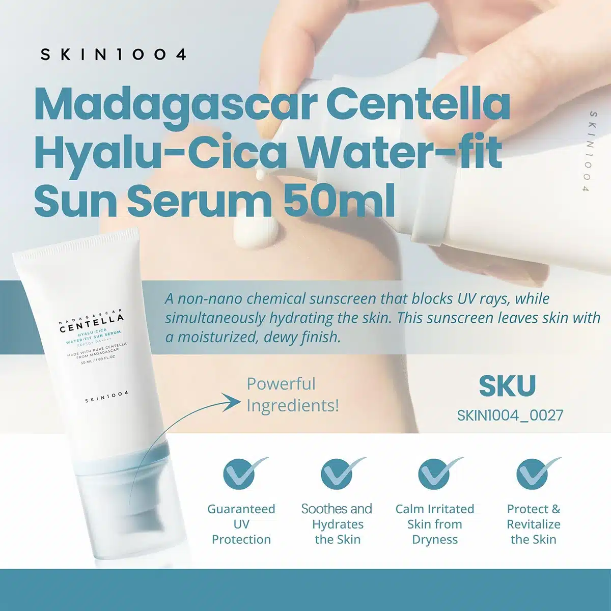 El SKIN1004 Madagascar Centella Hyalu-Cica Water-Fit Sun Serum SPF50+ PA++++ es un protector solar facial de última generación que combina una alta protección frente a los rayos UVA y UVB con un potente efecto hidratante y calmante. Diseñado especialmente para quienes buscan proteger su piel sin renunciar a una textura ligera y agradable, este producto actúa como un sérum ultraligero que se funde con la piel sin dejar rastro.