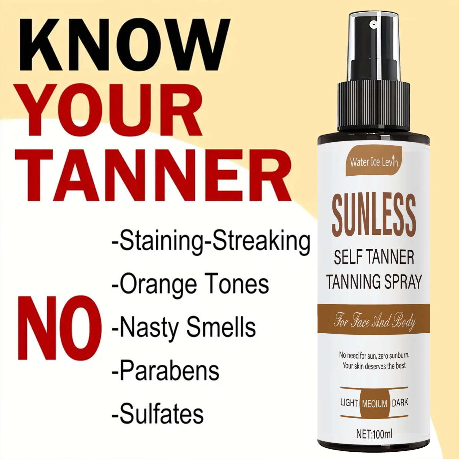 El spray autobronceador Water Ice Levin es una solución práctica para conseguir un tono bronceado natural sin necesidad de exposición prolongada al sol. Diseñado para hombres y mujeres, este autobronceador corporal permite mejorar visualmente el tono de la piel y lograr un aspecto más luminoso y uniforme en pocos minutos.
